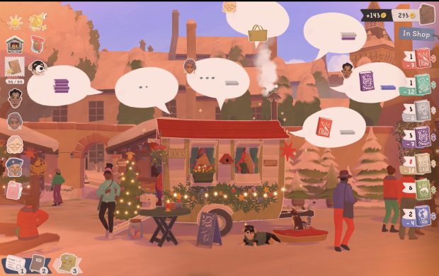 While exploring the different venues in town, you become acquainted with an eclectic cast of characters. As you get to know them and help them on little quests, you build out your business. Buy more bookshelves, find different paint colors at the flea market and customize your wagon, adopt some pets, acquire some flair for the wagon, too. Most of the items you choose to decorate the wagon have boosts for sales of certain genres, and some plants need specific areas to flourish (some like the salty sea air, for example). It can get a bit tricky as you unlock more venues and try to customize your wagon build-out for each venue’s clientele.